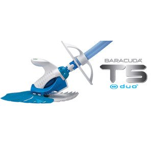 Zodiac Baracuda T5 Duo Pool Cleaner. The Baracuda T5 Duo™ is a disc-style suction-side pool cleaner that features Baracuda's one moving part technology and patented Dura-Life™ Diaphragm for maximum durability and quiet operation. The cleaner delivers maximum cleaning coverage with two independent discs for greater pool adhesion and flexibility, while the adjustable wheel deflector enables fluid navigation around corners, steps and ladders.
